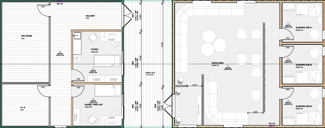 Inside, the layout includes a range of practical rooms. These include sleeping rooms, a quiet area, physio room, nurse or first aid room and operational support spaces. This arrangement helps organisations support both day-to-day operations and the wellbeing of the people using the space.