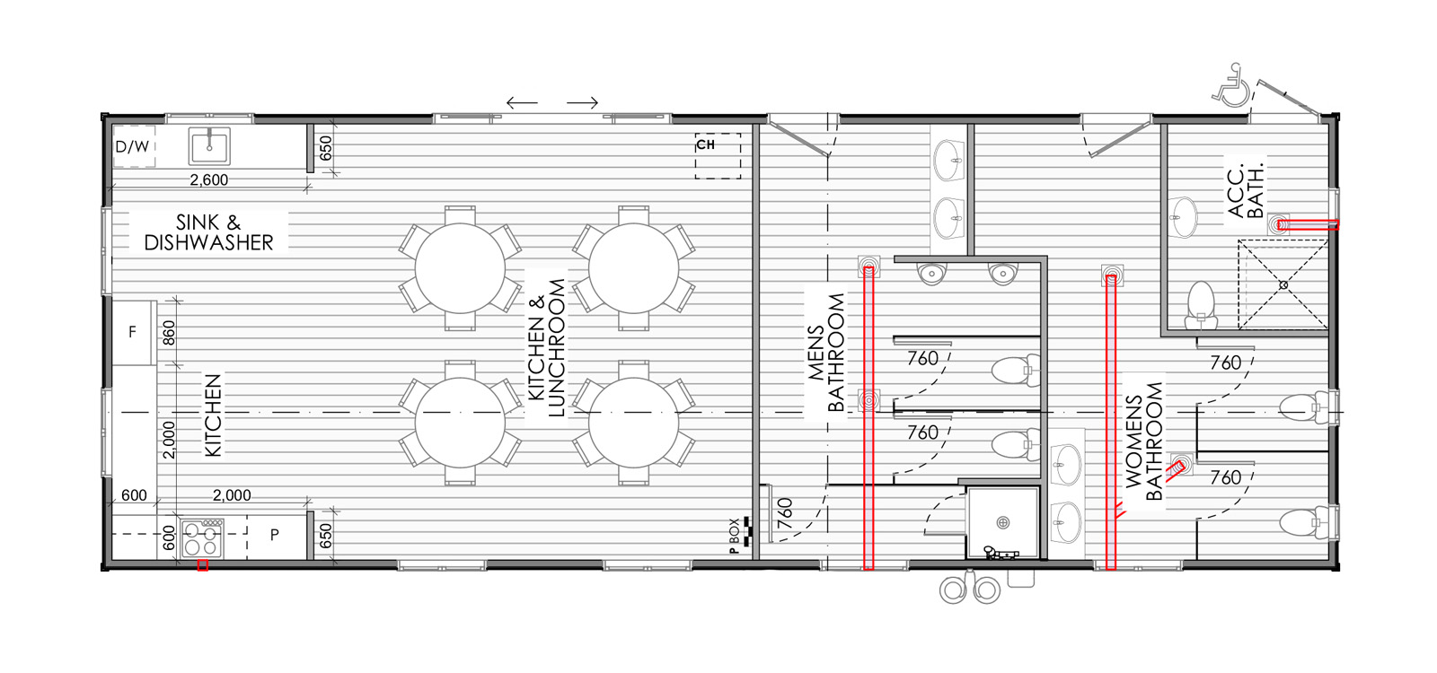 Accessibility female and male bathrooms with large open plan staff room and kitchen. Versatile building to complement the main office for staff.