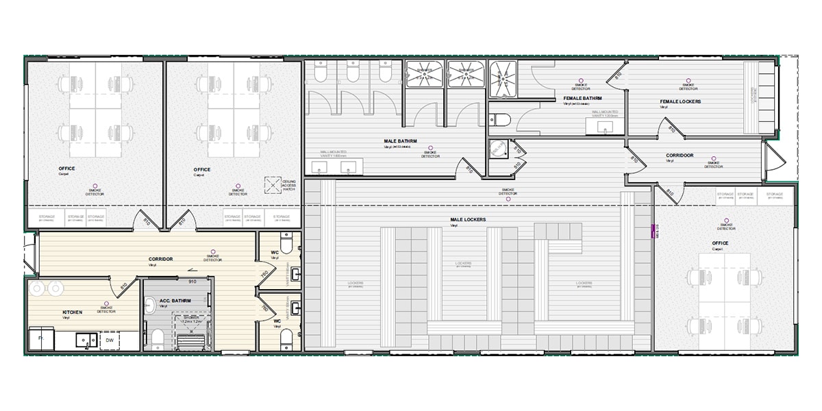 The opposite wing functions as a dedicated staff hub, complete with separate male and female changing areas, lockers, and modern bathroom facilities – including showers for staff on the go. A further enclosed office with four workstations ensures flexibility for leadership or specialised teams.
