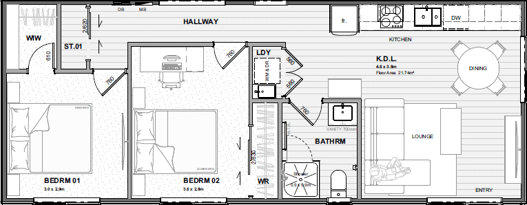 The master bedroom boasts a walk-in wardrobe, while the second bedroom provides versatility for guests and family. Whether you’re adding space for extended whānau, creating a rental opportunity, or planning a clever lifestyle upgrade, Transbuild’s Minor Dwellings and Granny Flat solutions deliver quality homes, fast – with turnkey plans ready to suit your needs. With our prefabricated build process, your project can be completed in months, not years.